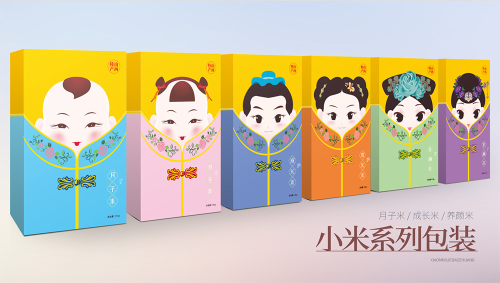區(qū)別于傳統(tǒng)小米包裝,根據(jù)小米的不同搭配將小米分為月子米,成長米,養(yǎng)顏米3類,視覺上分別以成對的嬰兒、小孩、年輕女性/媽媽為主要形象元素,采用現(xiàn)代插畫的形式創(chuàng)造三組萌趣生動的形象,畫面生動富有張力,配色清醒典雅,增強(qiáng)產(chǎn)品親和力。包裝盒外加設(shè)計有古典服飾圖形的封套,整體形式新穎富有層次感,拆掉封套將呈現(xiàn)另一幅畫面,開盒有趣味,讓整體形成記憶點。