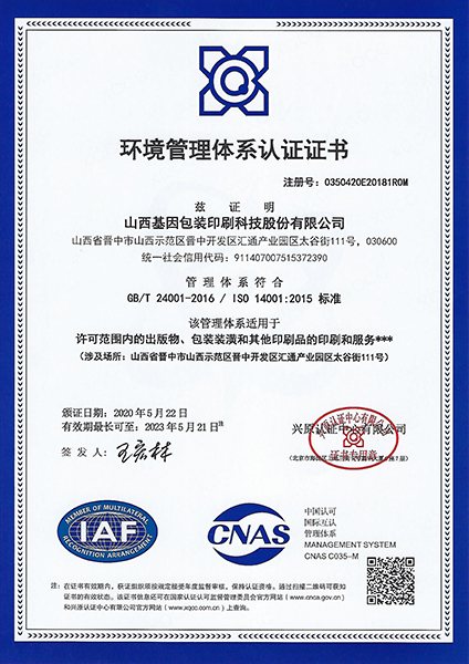 • 環境管理體系認證證書
