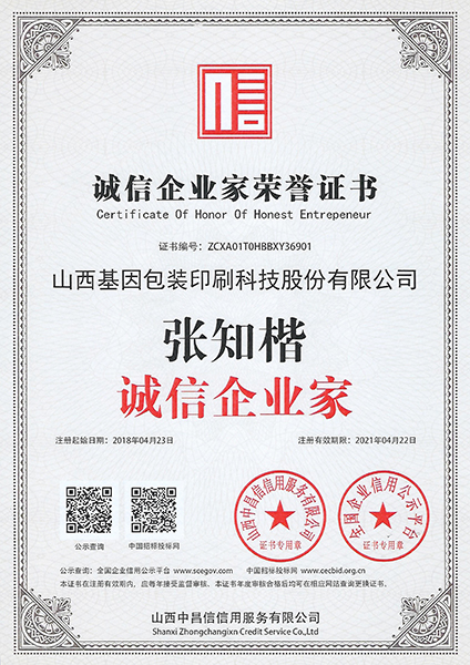 • 誠信企業家榮譽證書